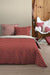 Cover de duvet o Funda nórdica, elaborada en 100% Algodón. Un patrón repetitivo de motivos geométricos o de inspiración floral/copo de nieve en color blanco con punto central beige, sobre un vibrante fondo rojo. Este diseño tradicional se adapta perfectamente a decoraciones rústicas, nórdicas o de temporada. En complemento con dos fundas de almohada a juego.